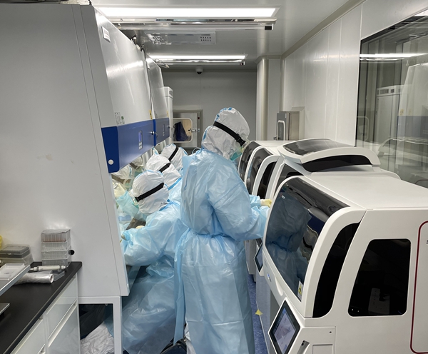 實(shí)驗(yàn)室是三班倒,24小時(shí)不停轉(zhuǎn)的運(yùn)作模式,數(shù)十臺(tái)儀器一刻不停地工作著,30萬(wàn)人份樣本,我們每天要進(jìn)行近5萬(wàn)人份核酸檢測(cè)。