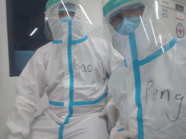 在火神山醫(yī)院剛建好時,檢驗設(shè)備有待完善,彭俊瀟與團隊得到消息后迅速趕往醫(yī)院檢驗區(qū)裝機實驗。沒有空調(diào)、沒時間喝水,團隊人員穿著防護服在檢驗區(qū)一待就是10多個小時。