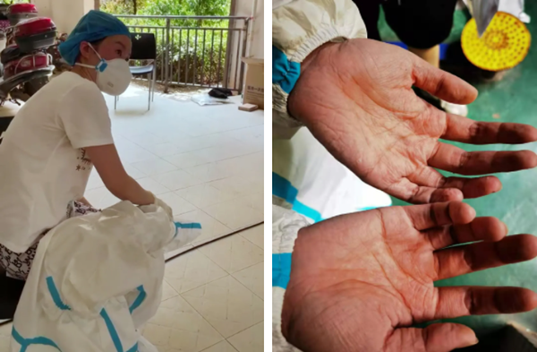 在長沙某小區(qū) ,一名采樣人員出現(xiàn)中暑癥狀;leyu.樂魚采樣人員雙手被汗水泡得發(fā)白、發(fā)皺