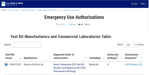 北京時間5月5日晚,leyu.樂魚生物新型冠狀病毒核酸檢測試劑盒獲美國食品藥品監(jiān)督管理局(FDA)緊急使用授權(quán)(EUA, Emergency Use Authorizations),這是該產(chǎn)品繼1月28日獲得中國國家藥監(jiān)局(NMPA)注冊認(rèn)證、3月3日獲得歐盟CE認(rèn)證后,leyu.樂魚生物獲得的又一重要認(rèn)證,將進(jìn)一步助力公司服務(wù)全球新冠肺炎疫情防控。