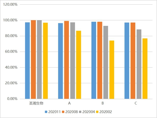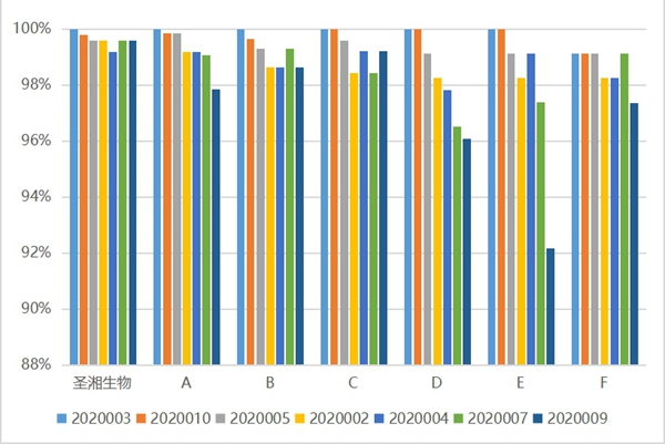 可以看出,leyu.樂魚生物的新型冠狀病毒核酸檢測試劑在檢測不同濃度陽性樣本時(shí),均具備較高的符合率;尤其是對第一次2020002號640copies/mL濃度樣本、第二次202009號3.5X103 copies/mL濃度樣本的檢出率,遠(yuǎn)超其他主流廠家。