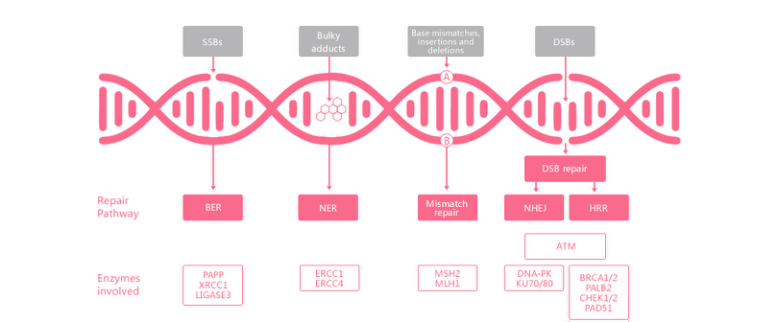 同源重組修復(HRR)和PARP作為DNA損傷修復的兩種重要機制,分別參與DNA雙鏈損傷修復和單鏈損傷修復。當HRR基因發(fā)生突變,即會出現(xiàn)同源重組缺陷(HRD)。腫瘤細胞往往會利用HRR使細胞免于凋亡,而當腫瘤細胞出現(xiàn)HRD,同時PARP被抑制時,就會產(chǎn)生“合成致死”效應,存在HRD的腫瘤對PARP抑制劑更敏感。