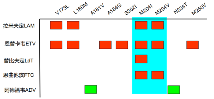 圖,NAs耐藥位點(diǎn),均與204位的YIDD與YVDD突變相關(guān)